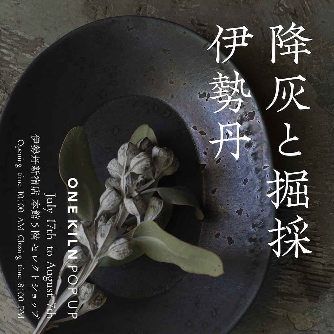 今回は "降灰と掘採" と題し、伊勢丹新宿店にONE KILNが展開する「ASH」と「CULTIVATE」シリーズの全作品を展示いたします。さらに、「ONE KILN Reproduction」によって生まれ変わった金継ぎ作品の展示や、鹿児島の工房の雰囲気を伝える展示棚もご用意いたしました。この展示が皆さまにとって、日常から少し離れた新たな探索の機会となれば幸いです。